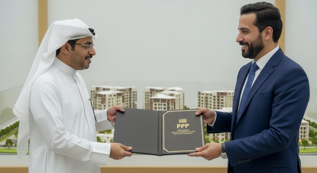 الحكومة طرحت 200 مشروعاً بنموذج PPP في 17 قطاعاً بينها الإسكان، ما يجعل المطوّر شريكاً لا مقاولاً فقط aninver.com. تُغطي الجهة الحكومية قيمة الأرض والبنية التحتية، بينما يتولّى المطور البناء والتشغيل، ثم يتقاسم الإيرادات.