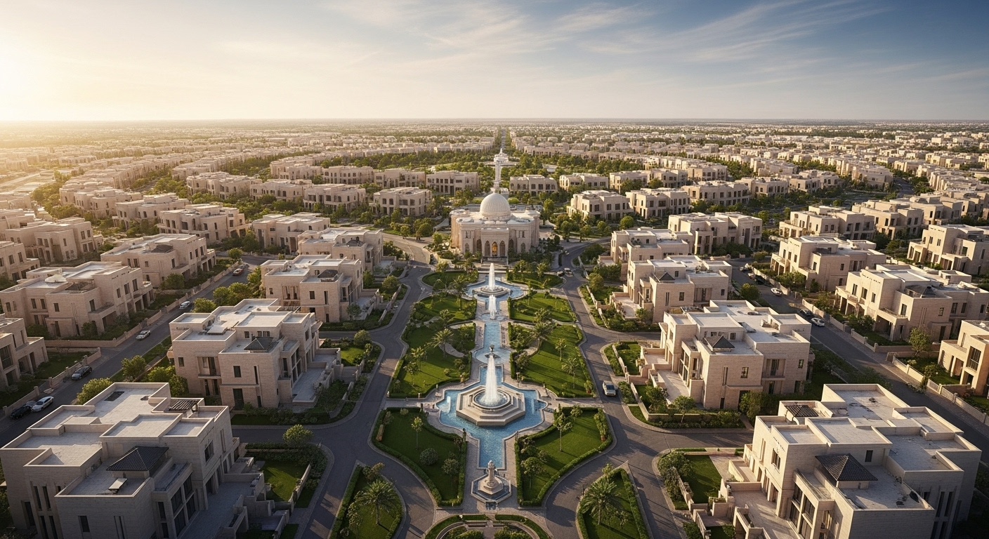 بعد اختيار الأرض، يُنشأ مخطط رئيسي يتبنى نظام الشبكة المترابطة؛ شوارع عريضة تظللها الأشجار، مسارات مشاة ودراجات، حديقة مركزية ومسجد ومدرسة ابتدائية صغيرة. تَوزُّع الخدمات بهذه الصورة يقلل الاعتماد على السيارة، ويرفع جودة الحياة ويزيد قابلية التسويق.